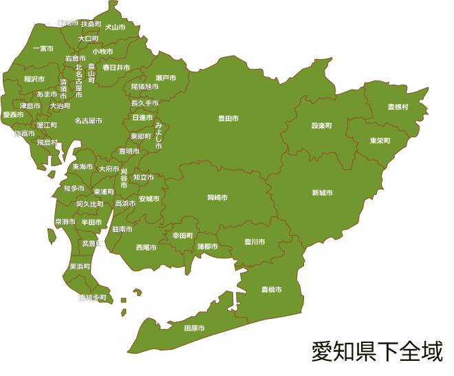 名古屋市、千種区、東区、北区、西区、中村区、中区、昭和区、瑞穂区、熱田区、中川区、港区、南区、守山区、緑区、名東区、天白区、豊橋市、岡崎市、、一宮市、瀬戸市、半田市、春日井市、豊川市、、津島市、碧南市、刈谷市、豊田市、安城市、西尾市、蒲郡市、犬山市、常滑市、江南市、小牧市、稲沢市、新城市、東海市、大府市、知多市、知立市、尾張旭市、高浜市、岩倉市、豊明市、日進市、田原市、愛西市、清須市、北名古屋市、弥富市、みよし市、あま市、長久手市